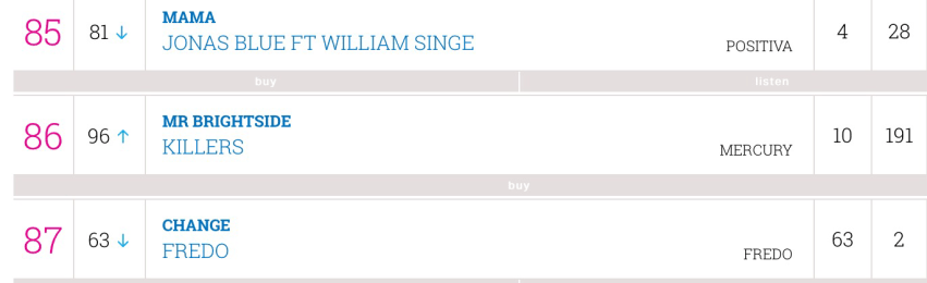 “Mr Brightside” by The Killers is currently the song that’s been in the U.K. Top 100 for the longest continuous period – an amazing 191 weeks.